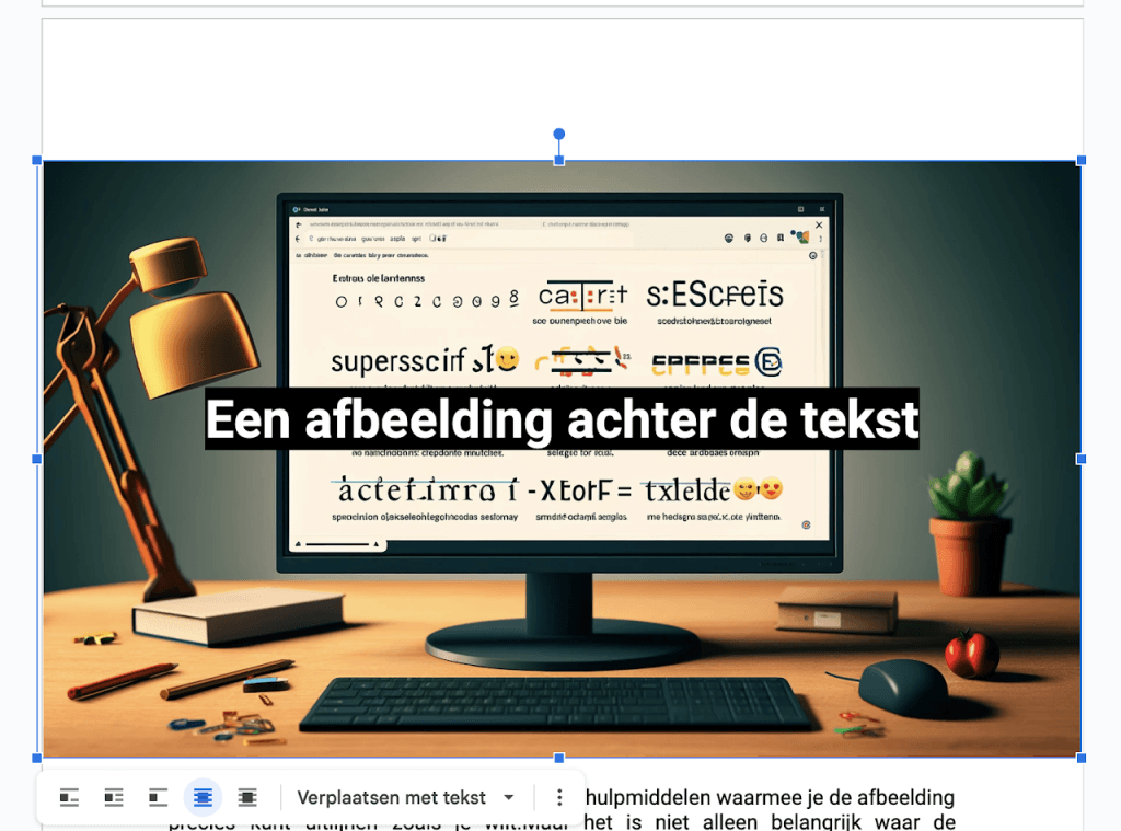 - Zorg er met Enters voor dat alleen de tekst Een afbeelding achter de tekst op de gewenste hoogte op de foto staat.