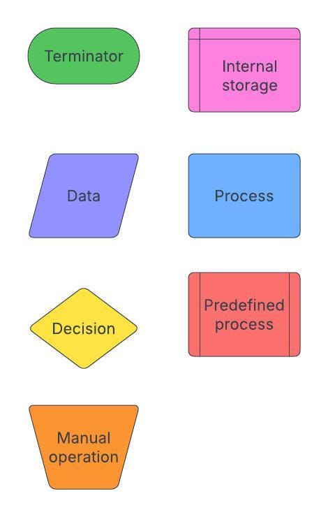 - Terminator (groen): Geeft het begin en einde van een programma aan.