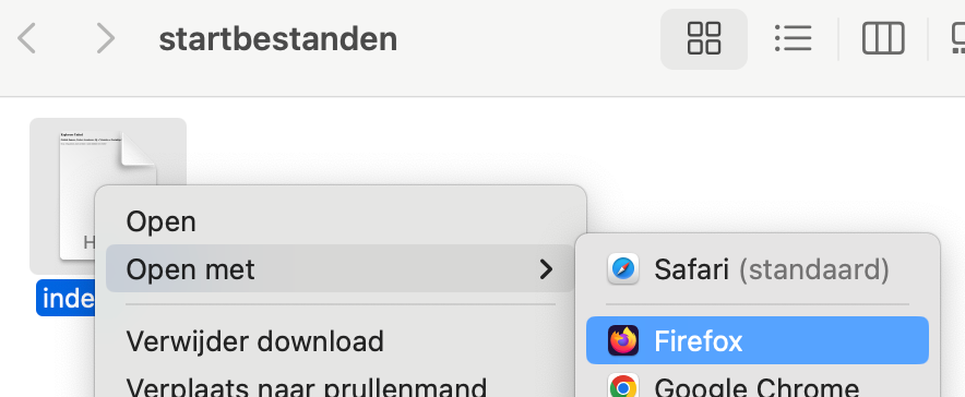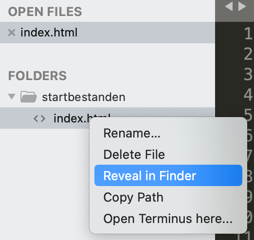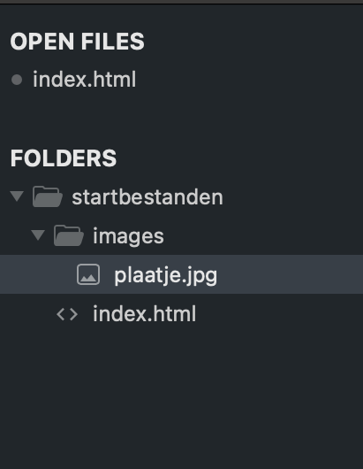 In de navigatiekolom van Sublime Text aan de linkerkant in het venster zie je een miniatuurtje van de map met daarin het bestand index.html.
