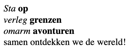 <p><em>Sta</em> <strong>op</strong><br><em>verleg</em> <strong>grenzen</strong><br><em>omarm</em> <strong>avonturen</strong> <br><span>samen ontdekken we de wereld!</span></p>