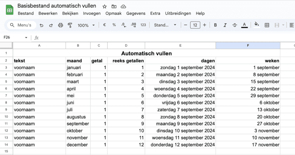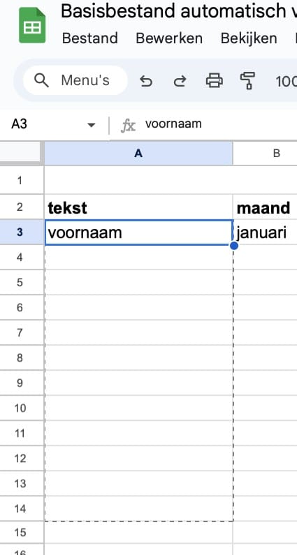 Die stip noemen we de vulgreep. - Sleep de stip met de muisknop ingedrukt naar beneden totdat er een stippellijn zichtbaar is rondom het gebiedA3:A14.
