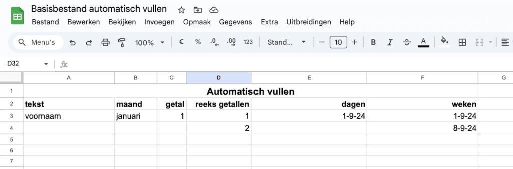Let steeds weer goed op wat er in de cellen komt te staan. - Selecteer nu de cellen D3:D4.