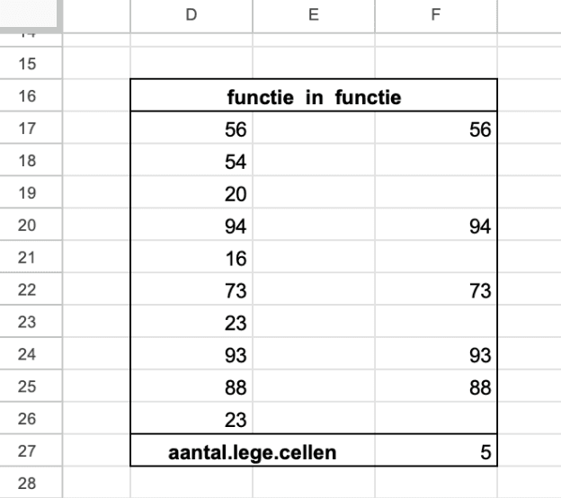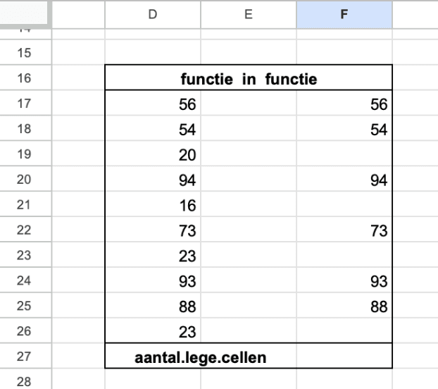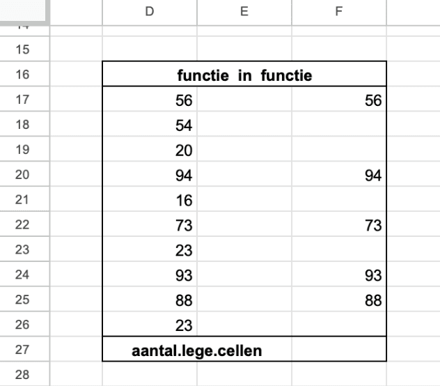 Deze functie geeft als resultaat het aantal lege cellen in het bereik H17:H26