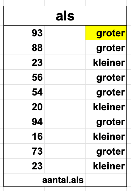 • Verander in de IF functie van alle 10 cellen het groter dan teken in het kleiner dan teken