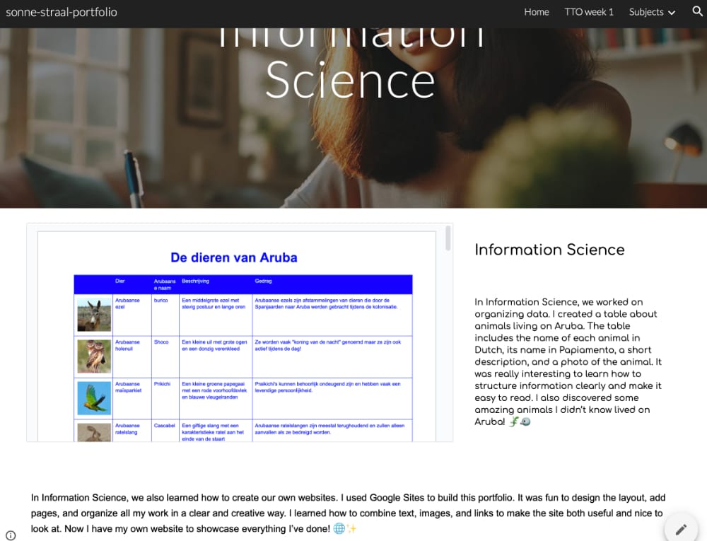 Plaats op de pagina information Science een Content block waarin je de tabel die je in Google Docs hebt gemaakt plaatst. Schrijf ook hier weer een korte tekst over de opdracht bij.