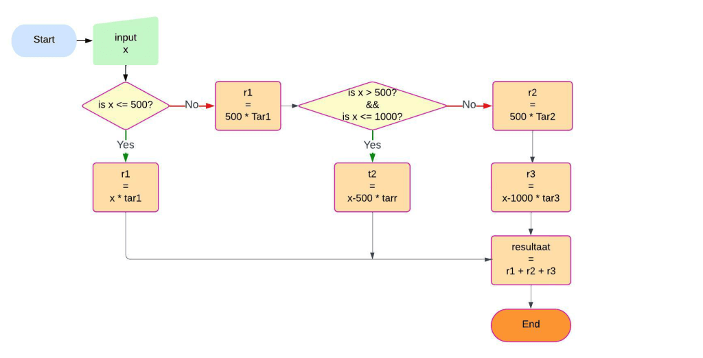 r2 = (x - 500) * Tar2; // alles boven de 500 kWh valt in het middelste tarief